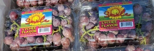 Lychee flavour grapes also known as Lychee grapes are medium in size and are round to oval in shape, growing in tight clusters. They come with mild lychee aroma and sweetness. The smooth skin matures from a pink to a red or purple, and when ripe, the grapes develop a silvery bloom or film, which is a protective coating that prevents the grapes from losing moisture. The translucent flesh is juicy and intensely sweet with a nice crunch that bursts with sweet juice. Lychee flavour grapevines also have deeply lobed, thick, green leaves that turn yellow in the autumn.