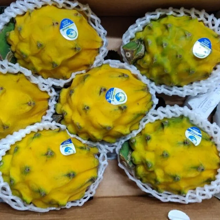 Yellow dragon fruit (also called yellow pitaya or yellow pitahaya) comes from the climbing cactus Hylocereus megalanthus that grows in Colombia, Ecuador and northern parts of South America. The plant can grow up to 15 feet tall.